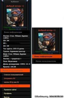 | Вставить в новый блок: Code $_REG_TIME$ $_REG_TIME$ <DIV align="center"><STRONG><script language="JavaScript"> function process(){} today = new Date() if((today.getHours() < 12) && (today.getHours() >= 6)) { document.write("<font color=#60befd>Доброе вам утро =)</font>")} if((today.getHours() >= 12) && (today.getHours() < 18)) { document.write("<font color=#8acf1d>Добрый день =)</font>")} if((today.getHours() >= 18) && (today.getHours() <= 23)) { document.write("<font color=#ee5000>Добрый вечер =)</font>")} if((today.getHours() >= 0) && (today.getHours() < 4)) { document.write("<font color=#878787>Вы сегодня поздновато =) </font>")} if((today.getHours() >= 4) && (today.getHours() <= 6)) { document.write("<font color=#d7d7d7>Вы сегодня рановато =) </font>")} </script> <br>$USERNAME$</strong> <br><?if($USER_AVATAR_URL$)?><img class="userAvatar" title="$USERNAME$" src="$USER_AVATAR_URL$" border="0"><?else?><?if($USER_LOGGED_IN$)?><img class="userAvatar" title="$USERNAME$" src="http://s56.radikal.ru/i152/0811/94/7504f641ae8e.png" border="0"><?else?><img class="userAvatar" title="$USERNAME$" src="http://s56.radikal.ru/i152/0811/94/7504f641ae8e.png" border="0"><?endif?><?endif?> <span style="font-weight: bold; color: rgb(0, 102, 0);"><br><font color="#006400">Группа:</font></span> <b>$USER_GROUP$ <div align="center"><font color="#006400"><strong>Время:</strong></font><b>$TIME$</b><br> <?if($USER_LOGGED_IN$)?> <div align="left"> <div id="middle"> <div class="background layoutleft"> <div id="left"> <div id="left_container" class="clearingfix"> <div id="submenu"> <ul class="mainmenu"> <li class="level2 parent toggler"> <span>Ваша информация</span> <div> <ul class="mainmenu accordion"> <DIV style="color: #ffffff"> <li class="level3">Логин: <b>$USER_FULL_NAME$ </b> </li> <li class="level3">ID: <b>$USER_ID$</b> </li> <li class="level3"> IP: $IP_ADDRESS$</li> <li class="level3"> ID: $USER_ID$ </li> <li class="level3"> Ты здесь $USER_REG_DAYS$-й день </li> <li class="level3"> Група: $USER_GROUP$ </li> <li class="level3"> Имя: $USER_FULL_NAME$ </li> <li class="level3"> Логин: $USERNAME$ </liz> <li class="level3"> Пол: $USER_GENDER$ </li> <li class="level3"> День рождения: $USER_BIRTHDAY$ </li> <li class="level3"> Время: $TIME$ </li></DIV> </ul> </div> </li> <div id="middle"> <div class="background layoutleft"> <div id="left"> <div id="left_container" class="clearingfix"> <div id="submenu"> <ul class="mainmenu"> <li class="level2 parent toggler"> <span>Меню пользователя</span> <div> <ul class="mainmenu accordion"> <li class="level3"><a href="javascript:openOnClick('users')">Список пользователей</a></li> <li class="level3"><a href="javascript:openOnClick('send')">Отправить ЛС</a></li> <li class="level3"><a href="/index/14">читать ЛС(у вас $UNREAD_PM$)</li></a></li> <li class="level3"><a href="javascript:openOnClick('options')">Изменить сведения</a></li> <li class="level3"><a href="http://www.bd-ru.net.ru/rules.htm">Правила сайта!</a></li> <li class="level3"><a href="/index/8">Профиль</a></li> <li class="level3"><a href="/index/10">Выход</li></a> </ul> </div> </li> </script> <?if($IS_NEW_PM$)?><script type="text/javascript">function flashit(id,cl){var c=document.getElementById(id);if (c.style.color=='red'){c.style.color=cl;}else {c.style.color='red';}}setInterval("flashit('upml2','')",500)</script><?endif?> </div> <script language=javascript type=text/javascript> function openOnClick(client_type) { if(client_type=="mail")clientWindow = window.open("$PM_URL$","pmw","scrollbars=1,top=0,left=0,resizable=1,width=850,height=350") || alert("Отключите блокировку всплывающих окон!"); if(client_type=="send")clientWindow = window.open("/index/14-999-0-1","pms","scrollbars=1,top=0,left=0,resizable=1,width=850,height=350") || alert("Отключите блокировку всплывающих окон!"); if(client_type=="options")clientWindow = window.open("/index/11","options","scrollbars=1,top=0,left=0,resizable=1,width=680,height=350") || alert("Отключите блокировку всплывающих окон!"); if(client_type=="users")clientWindow = window.open("$USERS_LIST_URL$","users","scrollbars=1,top=0,left=0,resizable=1,width=680,height=350") || alert("Отключите блокировку всплывающих окон!"); } </script> <?else?> <DIV align="center"> <br>Здравствуйте, уважаемый посетитель. К сожалению, Вы не были распознаны Сайтом <BR>$HOME_PAGE_LINK$ .<BR>Пожалуйста <a href="$HOME_PAGE_LINK$/index/3" title="Регистрация">зарегистрируйтесь</a> или <a href="$LOGIN_LINK$" title="Вход">авторизуйтесь!</a> <?endif?></div> <style type="text/css" media="all">@import url(http://www.bd-ru.net.ru/css/engine.css);</style> <style type="text/css" media="all">@import url(http://www.bd-ru.net.ru/css/extensions.css);</style> <style type="text/css" media="all">@import url(http://www.bd-ru.net.ru/css/general.css);</style> <style type="text/css" media="all">@import url(http://www.bd-ru.net.ru/css/login.css);</style> <style type="text/css" media="all">@import url(http://www.bd-ru.net.ru/css/style.css);</style> <!--[if IE 6]><style type="text/css" media="all">@import url(http://www.bd-ru.net.ru/css/ie6hacks.css);</style><![endif]--> <!--[if IE 7]><style type="text/css" media="all">@import url(http://www.bd-ru.net.ru/css/ie7hacks.css);</style><![endif]--> <!--[if lte IE 7]><style type="text/css" media="all">@import url(http://www.bd-ru.net.ru/css/iehacks.css);</style><![endif]--> <script language="javascript" src="http://www.bd-ru.net.ru/scripts/base.js" type="text/javascript"></script> <s