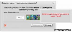 }})});}},'<div style="padding:5px 3px;"><div align="center">Повысить репутацию пользователю <b>$USER$</b> за <b>' + l + '</b>?</div><fieldset class="codekarma" style="margin-top:5px;padding:5px;"><legend><b>Код безопасности</b></legend><table width="100%"><tr><td style="padding-right:7px;" width="45%" align="right"><input class="inpkarmacapcha" maxlength="4" style="width:45px;height:16px;text-align:center;" type="text"/></td><td width="55%" align="left"><img style="width:110px;height:35px;cursor:pointer" class="imgkarmacapcha" src="" title="Обновить код безопасности" style="cursor:pointer"/></td></tr></table></fieldset><fieldset class="prodkarma" style="padding:5px;"><table border="0" cellpadding="2" cellspacing="1" width="100%"><tr><td id="frmakarma"><div style="display:none;" class="myWinLoadSD myWinLoadSDQw"></div></td><td align="right"><table border="0" cellpadding="0" cellspacing="0" onmousedown="this.className=\'downBtn\'" onmouseover="this.className=\'overBtn\'" onmouseout="this.className=\'outBtn\'"><tr><td class="myBtnLeft"><img alt="" border="0" src="http://s1.ucoz.net/img/1px.gif"/></td><td class="myBtnCenter"><div class="myBtnCont x-unselectable postkarma" unselectable="on"><a href="javascript://">Продолжить</a></div></td><td class="myBtnRight"><img alt="" border="0" src="http://s1.ucoz.net/img/1px.gif"/></td></tr></table></td><td style="padding-left:5px;" width="1%" align="right"><table border="0" cellpadding="0" cellspacing="0" onmousedown="this.className=\'downBtn\'" onmouseover="this.className=\'overBtn\'" onmouseout="this.className=\'outBtn\'"><tr><td class="myBtnLeft"><img alt="" border="0" src="http://s1.ucoz.net/img/1px.gif"/></td><td class="myBtnCenter"><div class="myBtnCont x-unselectable" unselectable="on" onclick="_uWnd.close(\'karmap\')"><a href="javascript://">Отмена</a></div></td><td class="myBtnRight"><img alt="" border="0" src="http://s1.ucoz.net/img/1px.gif"/></td></tr></table></td></tr></table></fieldset></div>');